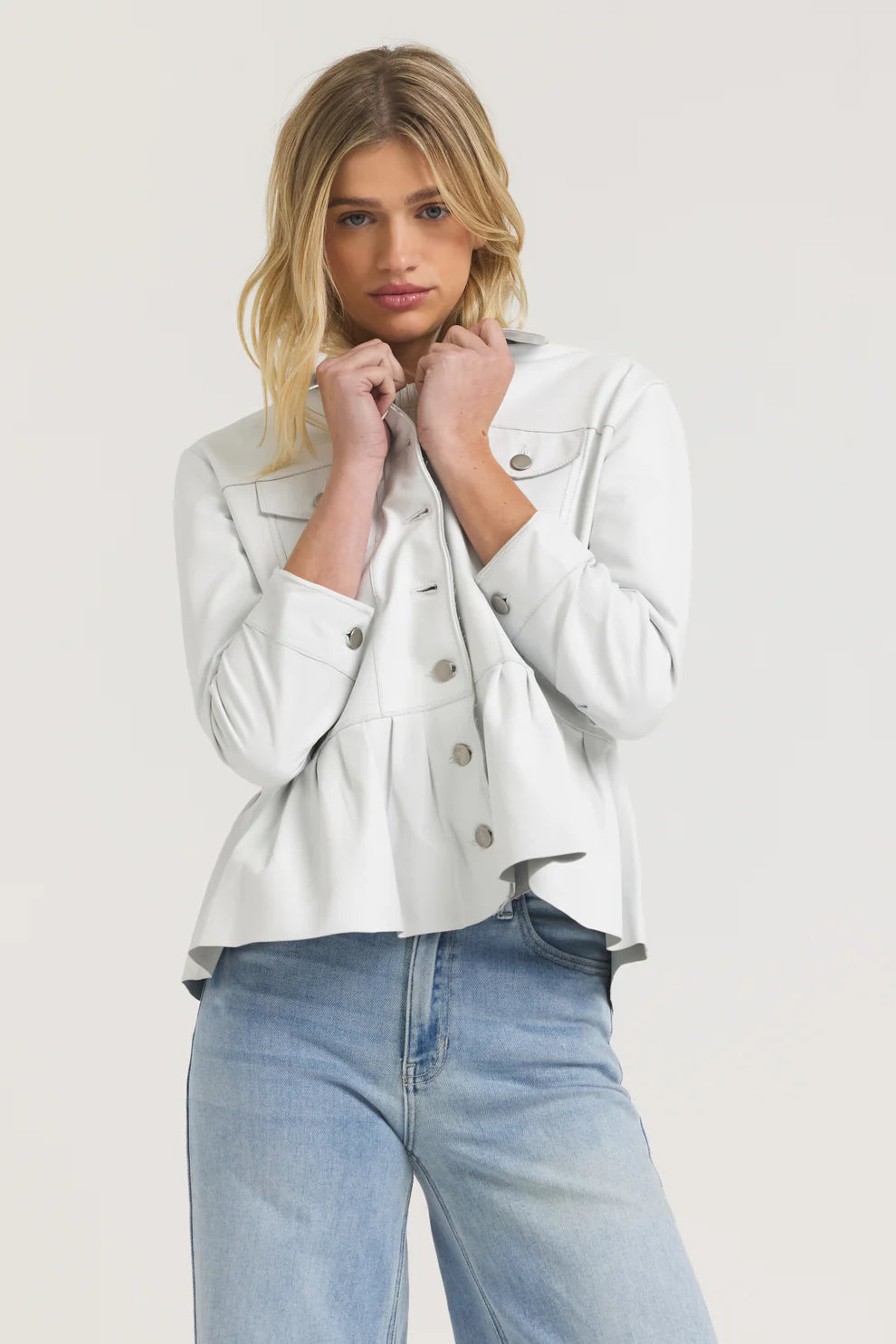 This Brie Burnished Leather jacket features a cropped silhouette with classic jean-style panelling and a feminine peplum flare. Crafted from 100% leather in a crisp white shade with a subtle sheen, it offers a soft structure and light drape. Western-inspired yoke seams, chest flap pockets, and metal snap closures enhance its refined design. The gathered hem creates a slight flare, balancing a structured shoulder with a relaxed waist for a true-to-size, flattering fit.