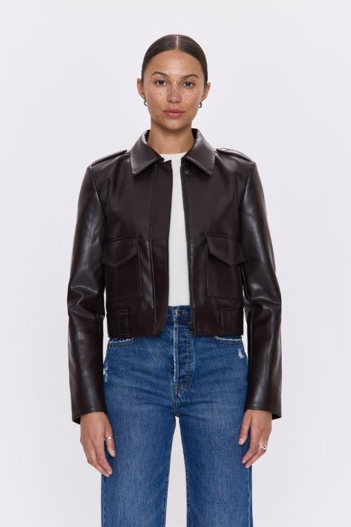 A modern update to the classic leather jacket, Bex is cut with a cropped, shrunken fit that delivers edge without bulk. Designed with a sharp collar, front flap pockets, and sleek lines, it’s crafted from buttery soft alternative leather in French Roast, a deep brown with rich sheen, for a finish that feels both polished and cool.