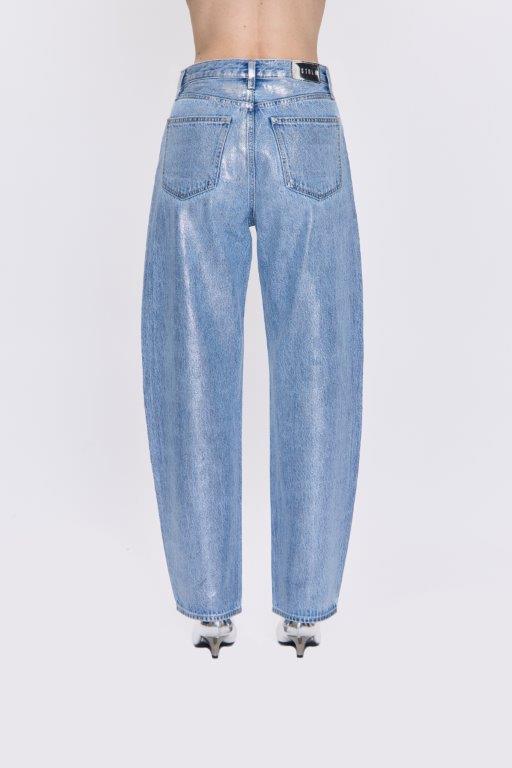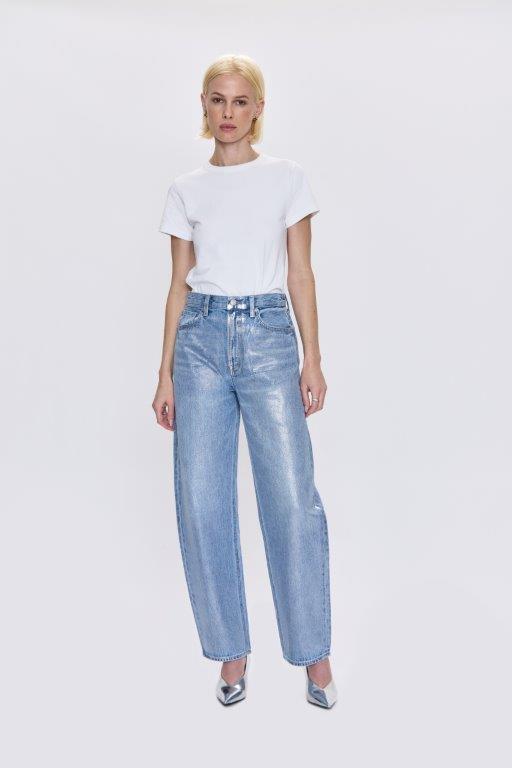 The best-selling jean that redefines modern denim. Wes sits at a flattering high rise with a stylish barrel leg silhouette and full-length 30" inseam that creates sophisticated drama. Clean hem finishes add polished detail to the contemporary silhouette. Crafted from our premium rigid non-stretch denim in Spellbound, a captivating light blue wash with a luminous sheen that catches the light beautifully. Finished with a branded metallic patch on the back that adds signature shine.