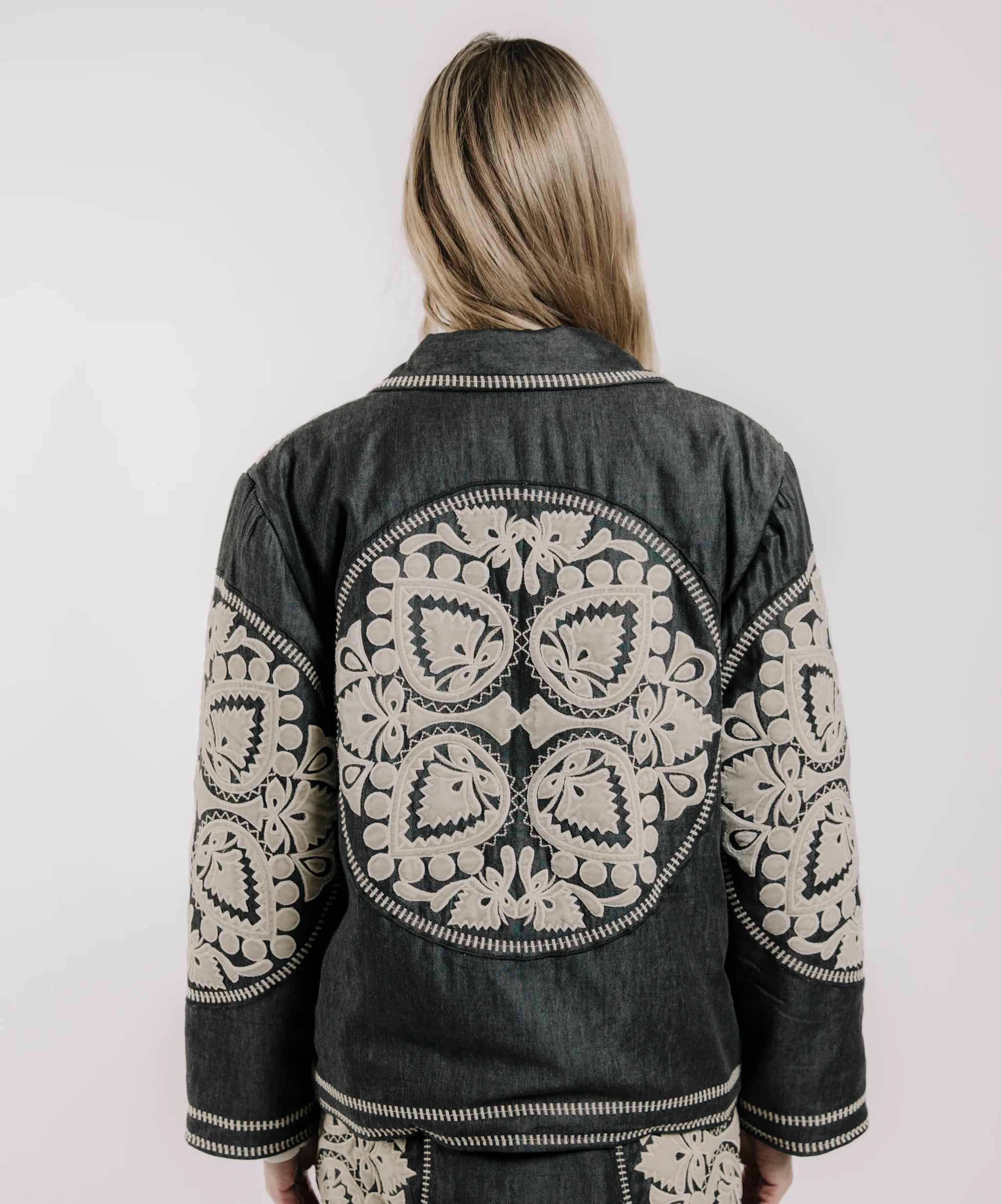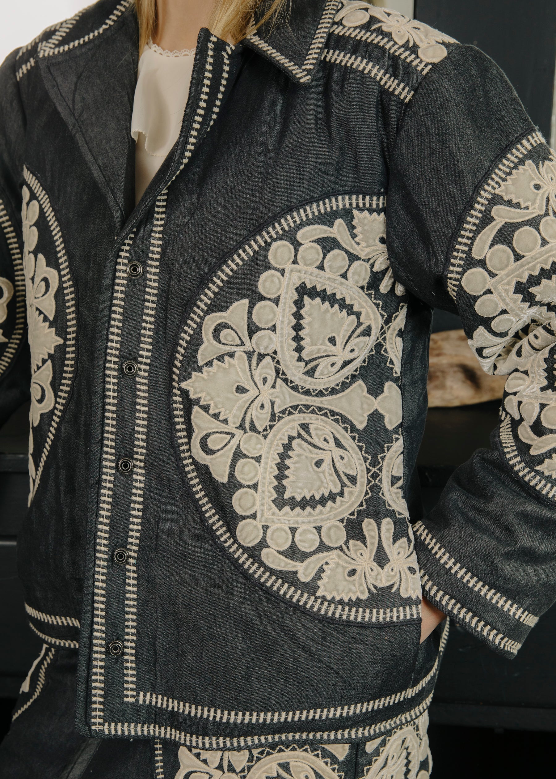 The Jamie Jacket is a quilted charcoal denim button-up, adorned with enlarged velvet ivory applique in striking circular motifs. Featuring a structured silhouette, classic collar, and front snap closure