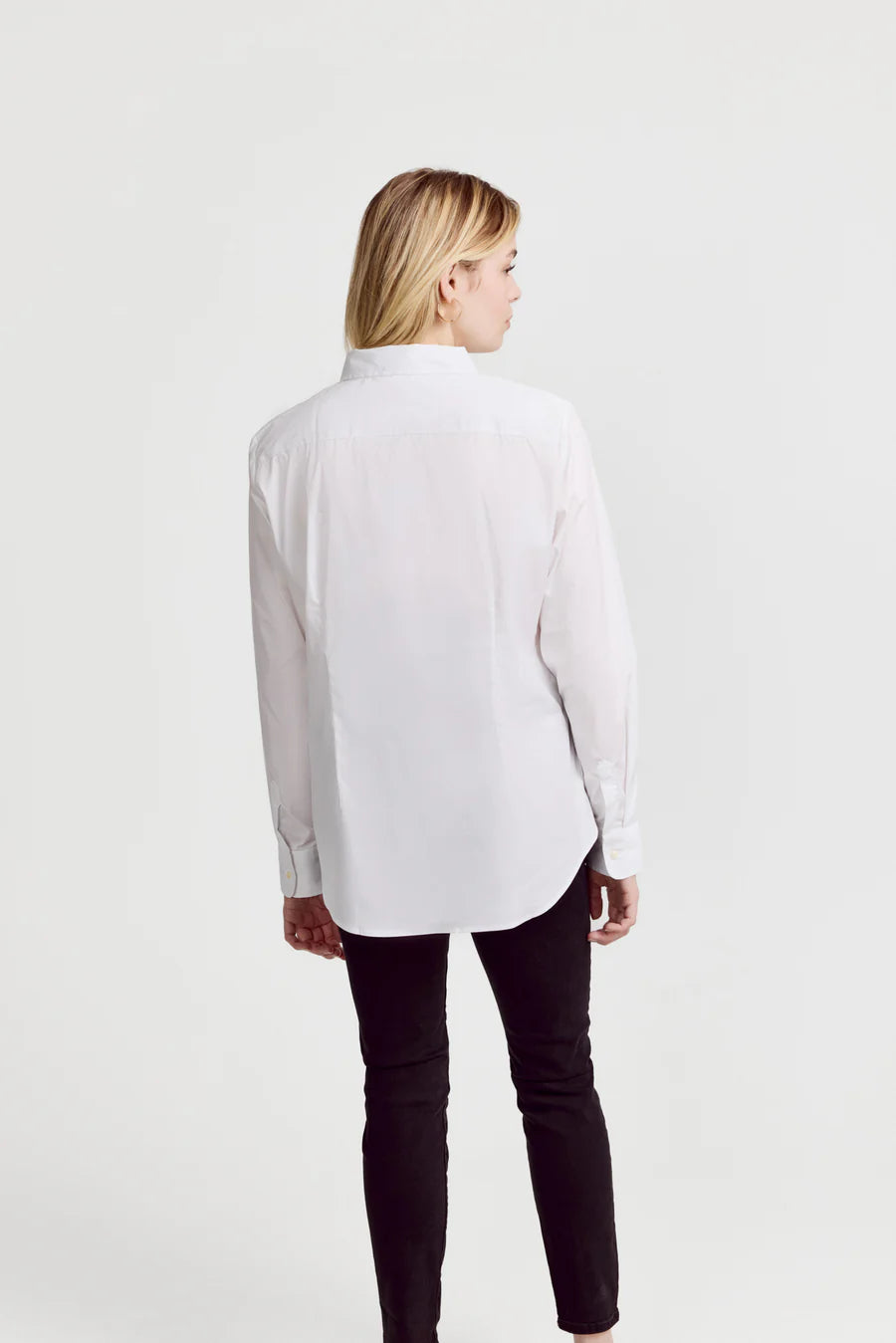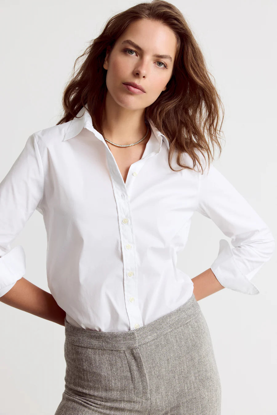 Our perfect fit cotton stretch button down. We designed our best-selling Icon Shirt to be fitted throughout, giving you a body-hugging shape yet eliminating blouse gape completely.  Our cotton stretch is sourced from a family-run mill in Spain and produced in our factory in Portugal by a local team of artisans.