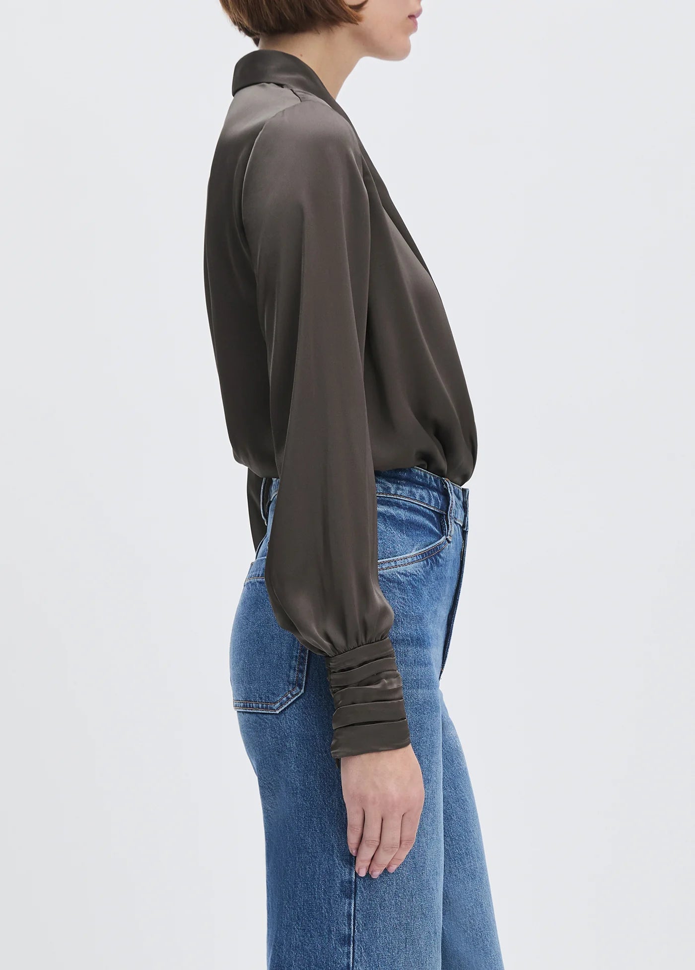 The Better Off Bodysuit combines luxurious silky satin with elegant blouson crossover styling for a flattering fit. Its pleated zip cuffs add a refined, modern touch, making it perfect for both sophisticated evenings and stylish daywear. This bodysuit offers comfort without compromising on chic design, ensuring you look and feel effortlessly polished.