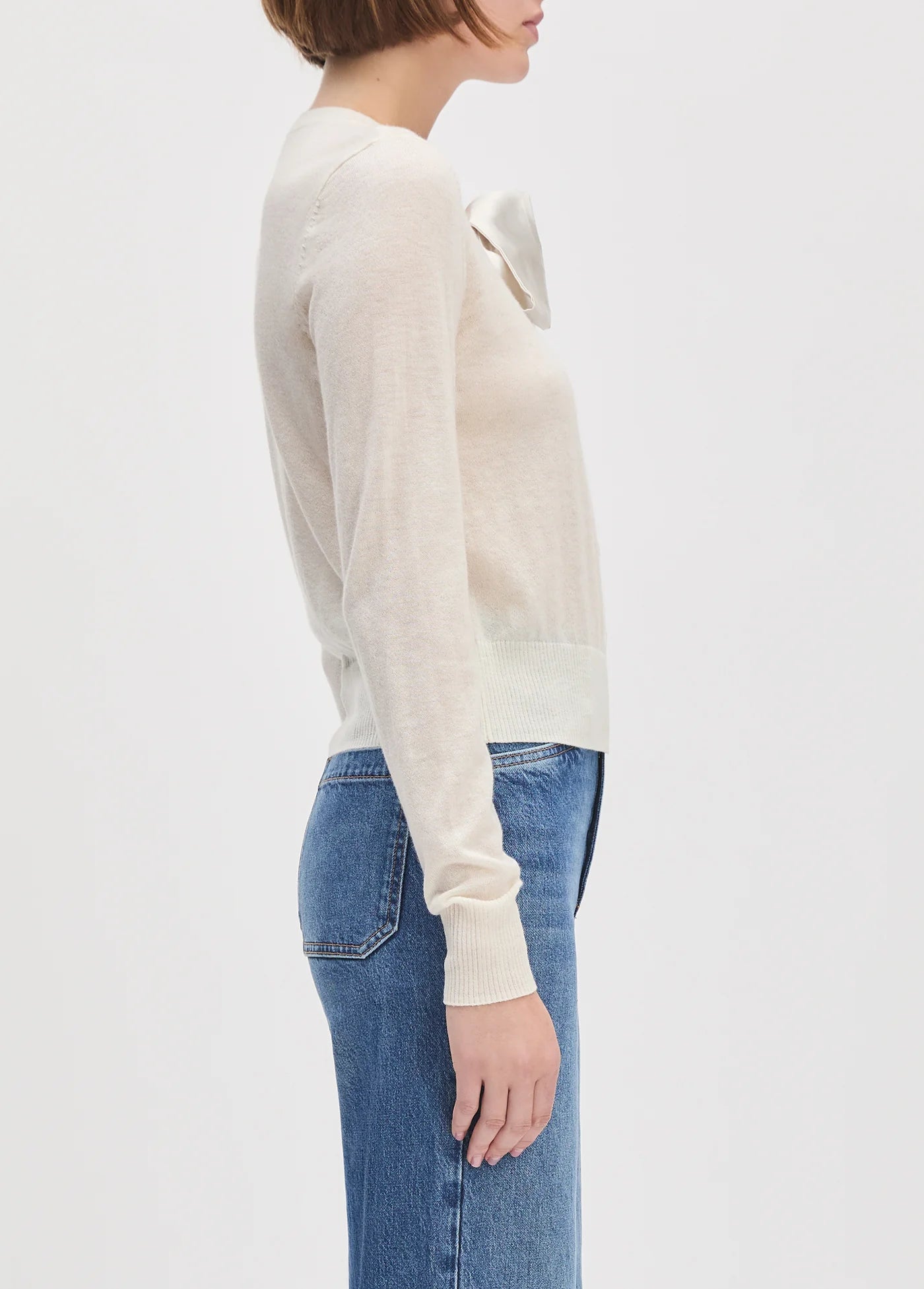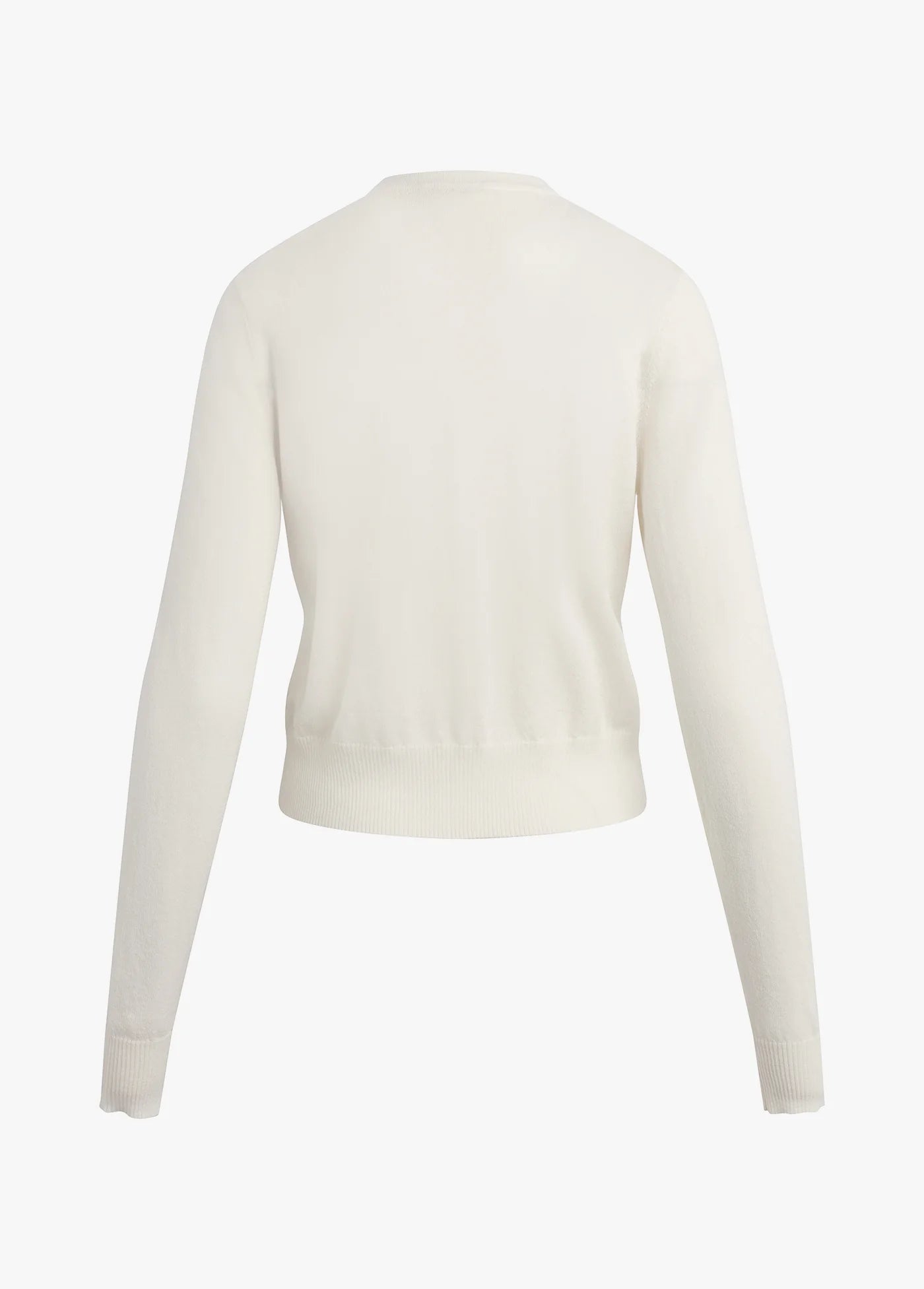 Our ivory crewneck cardigan in soft, merino wool is that timeless classic your closet is missing. It has a slim fit for a tailored look with satin-covered buttons. Our favorite part is the detachable satin bow.